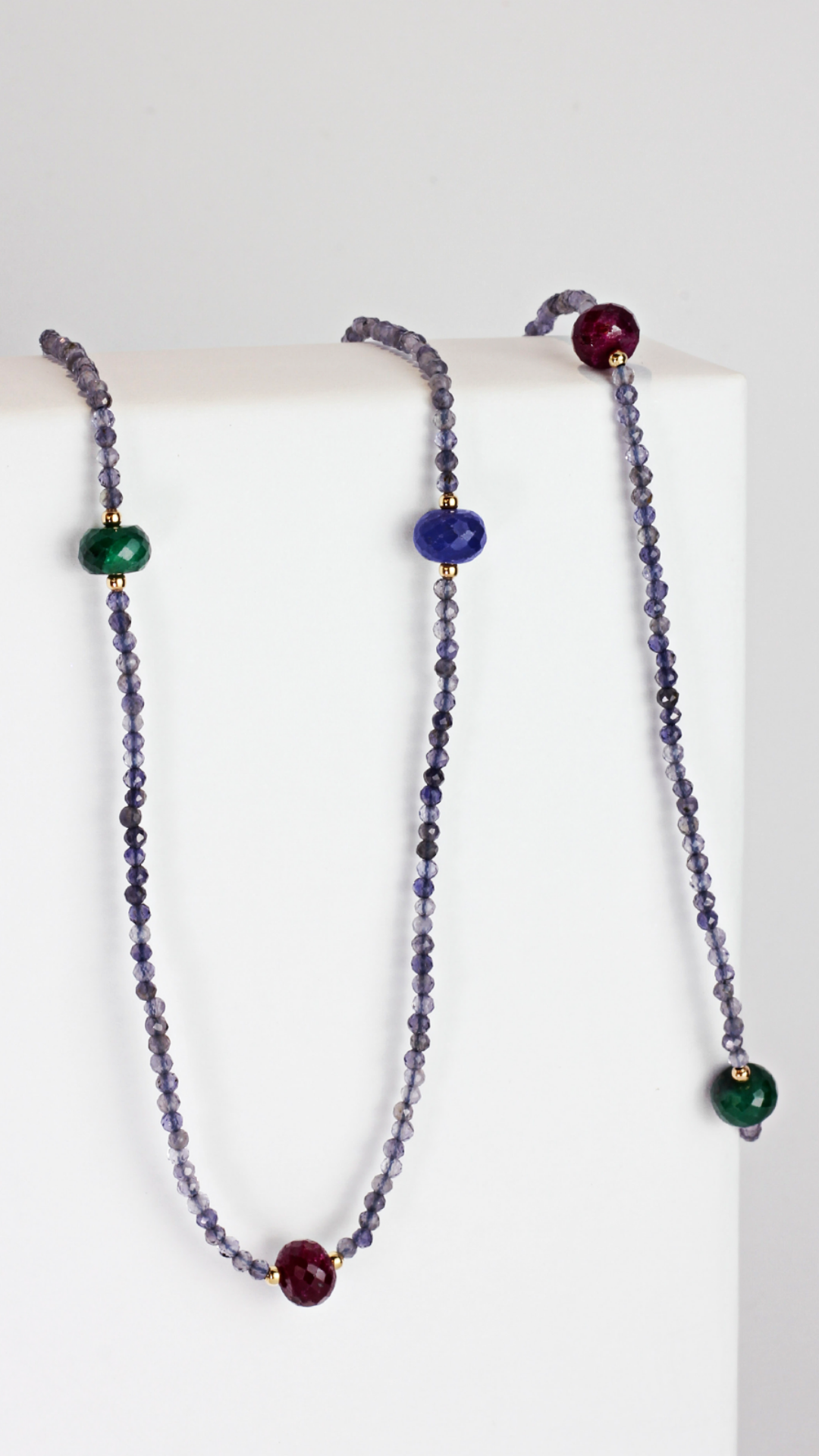 Colar com Iolita, 2 Safiras, 2 Esmeraldas, 2 Rubis e 12 esferas em Ouro amarelo 18k. Comprimento: 60cm.