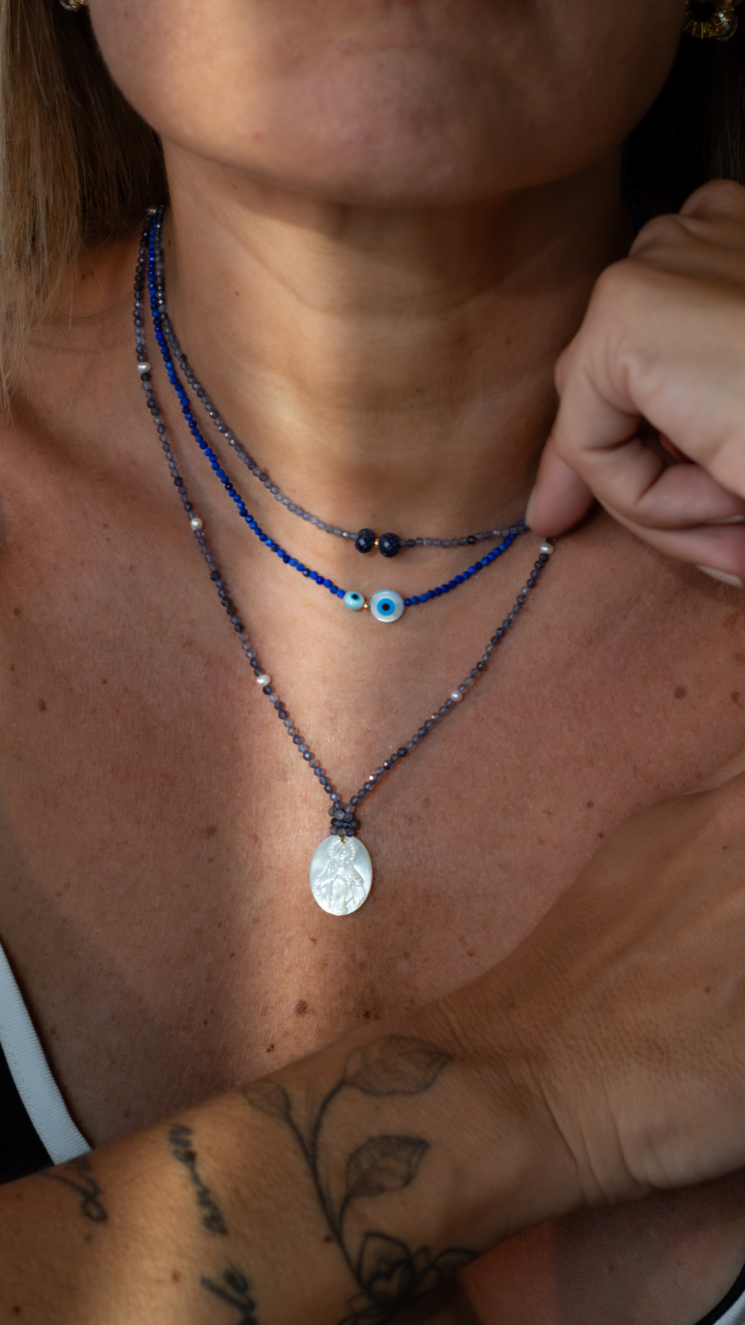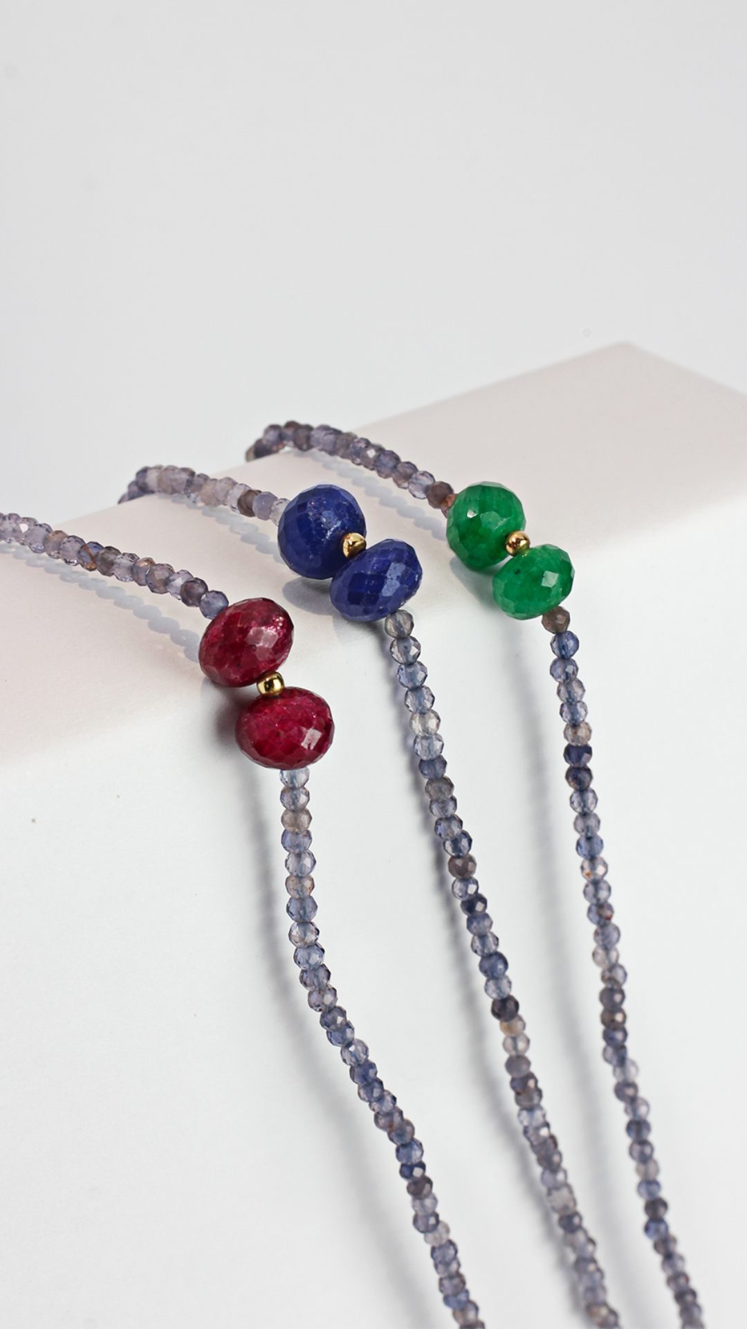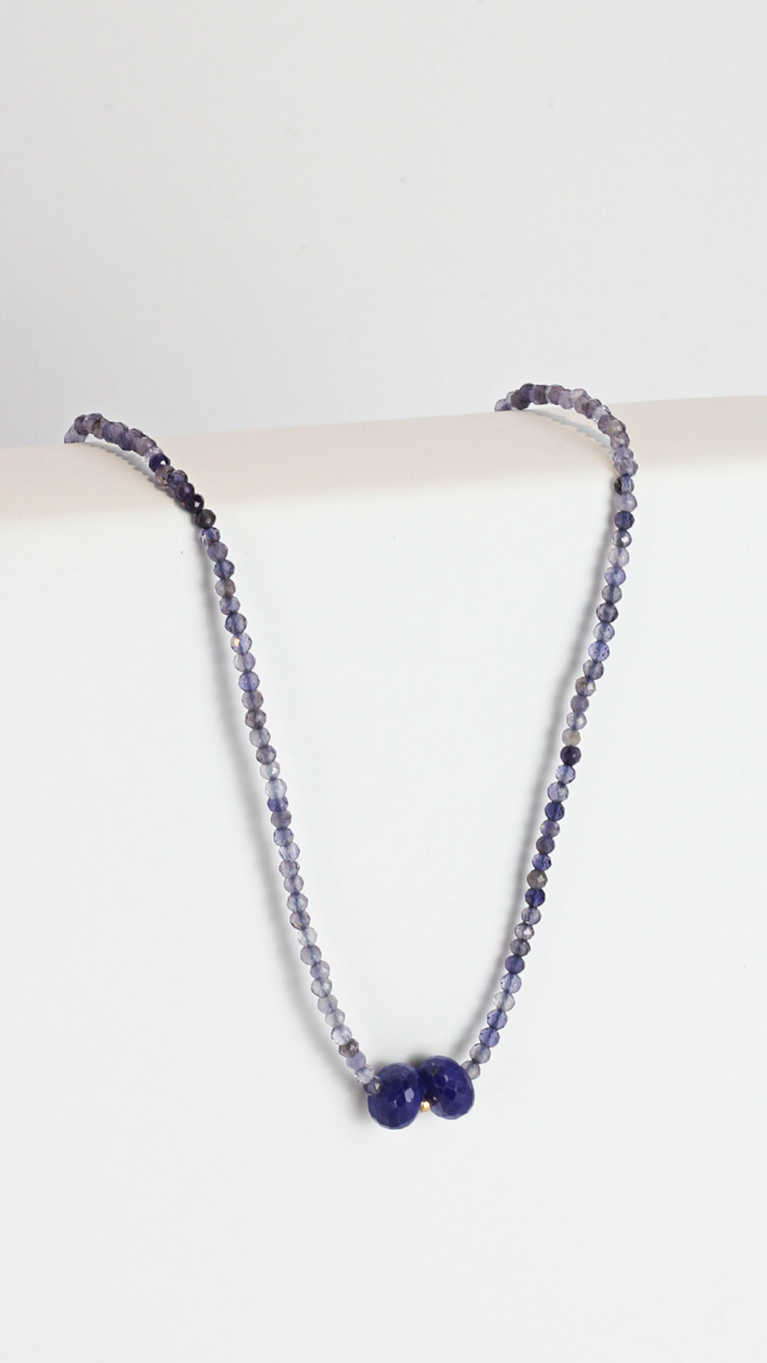 Colar com Iolita, 2 Safiras e 1 esfera em Ouro amarelo 18k. Comprimento: 40cm.
