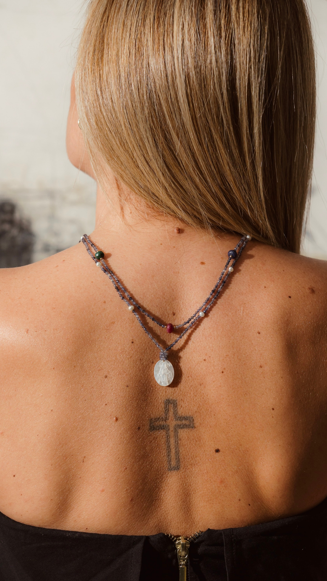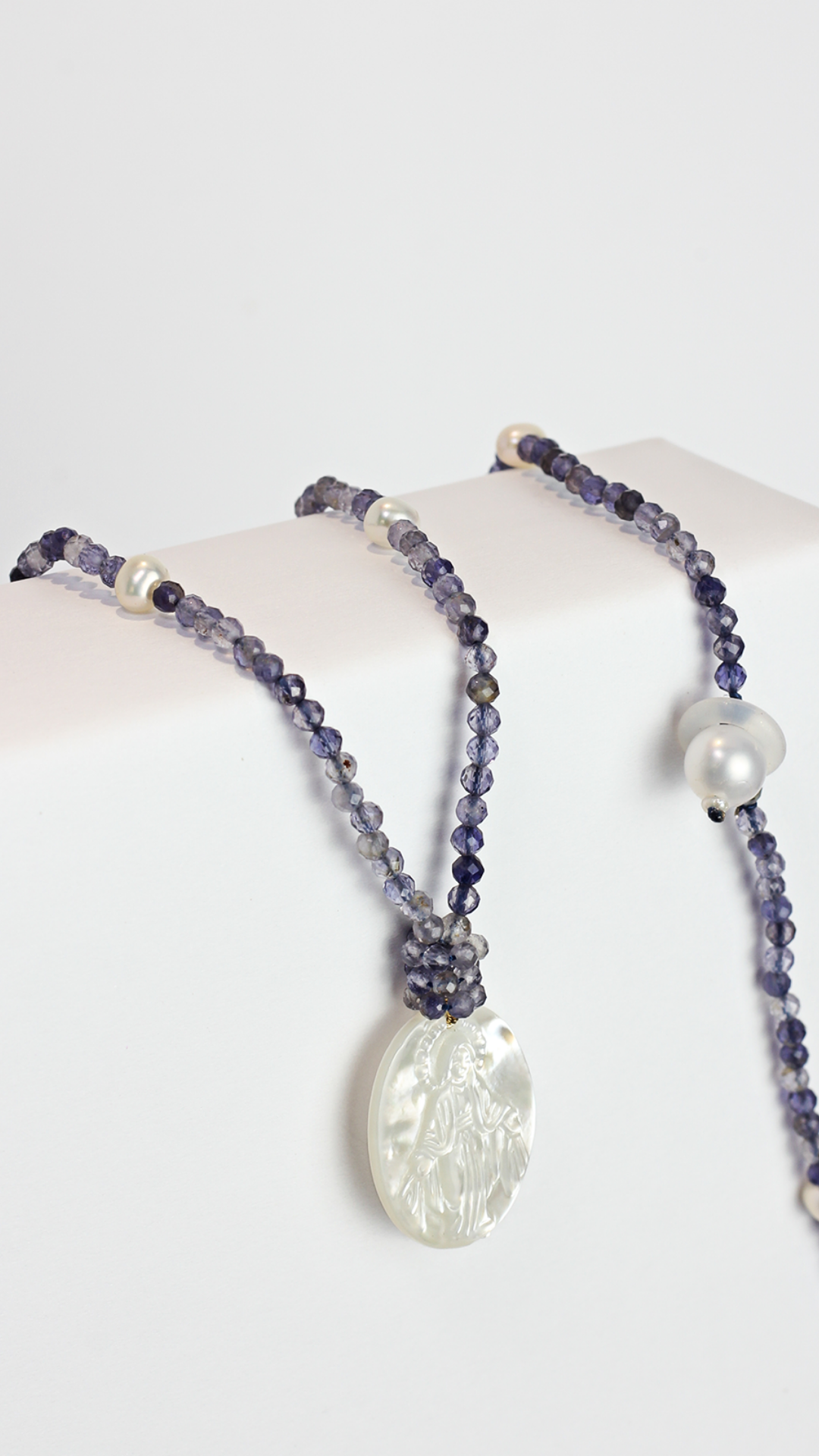 Colar com Iolita e Pérola e "Nossa Senhora das Graças" em Madrepérola. Comprimento: 50cm.