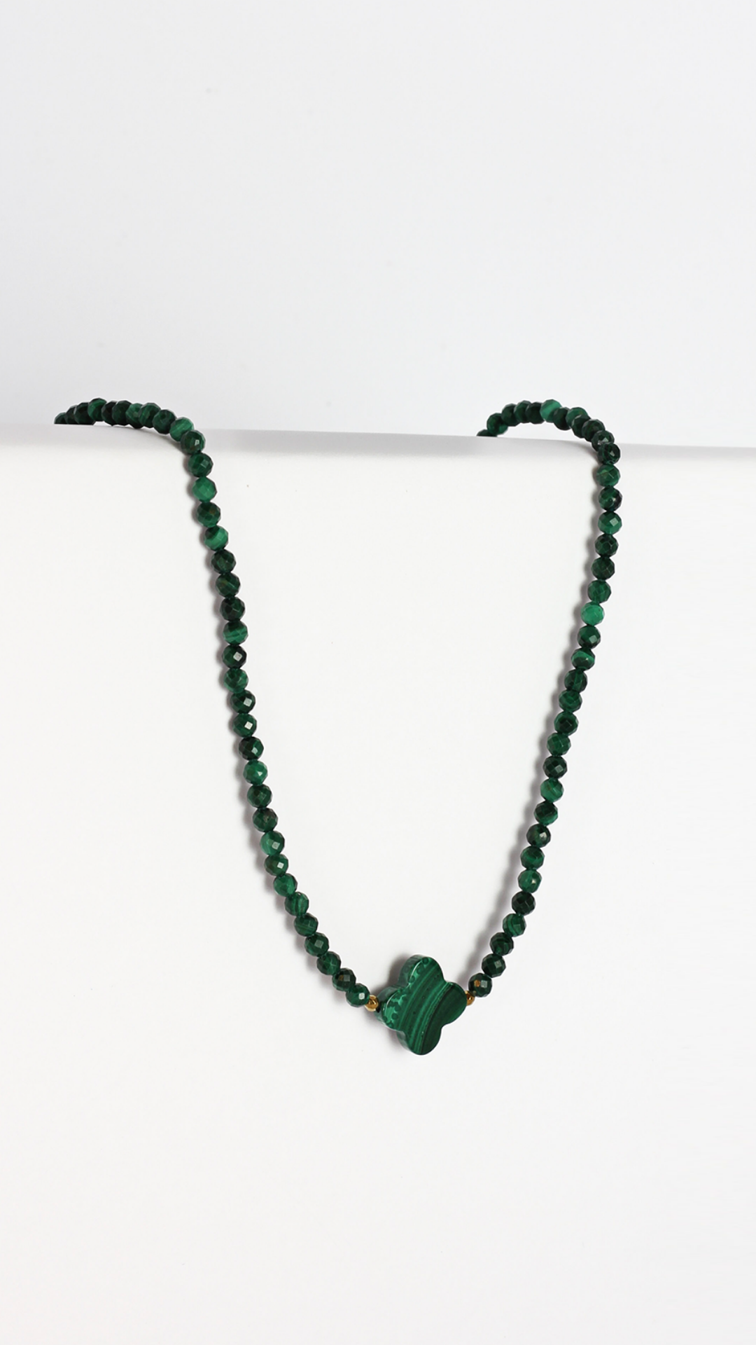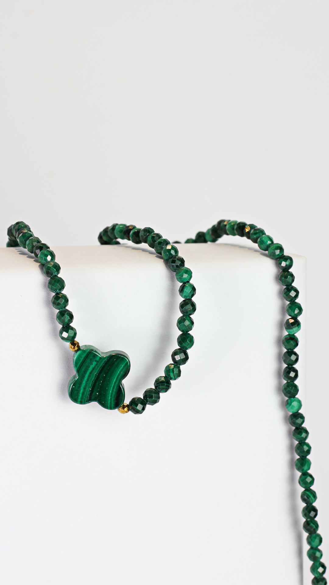 Colar com Malaquita, Trevo e 2 esferas em Ouro amarelo 18k. Comprimento: 40cm.
