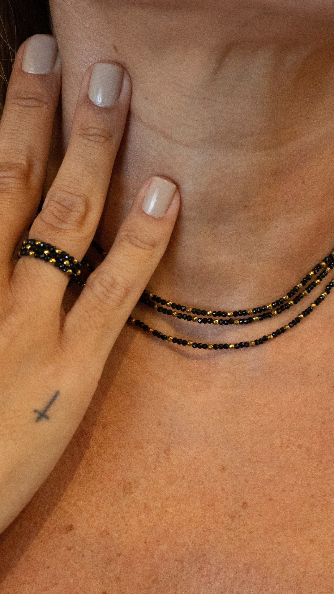 Colar com Espinélio Negro e Hematita dourada. Comprimento: 42cm.