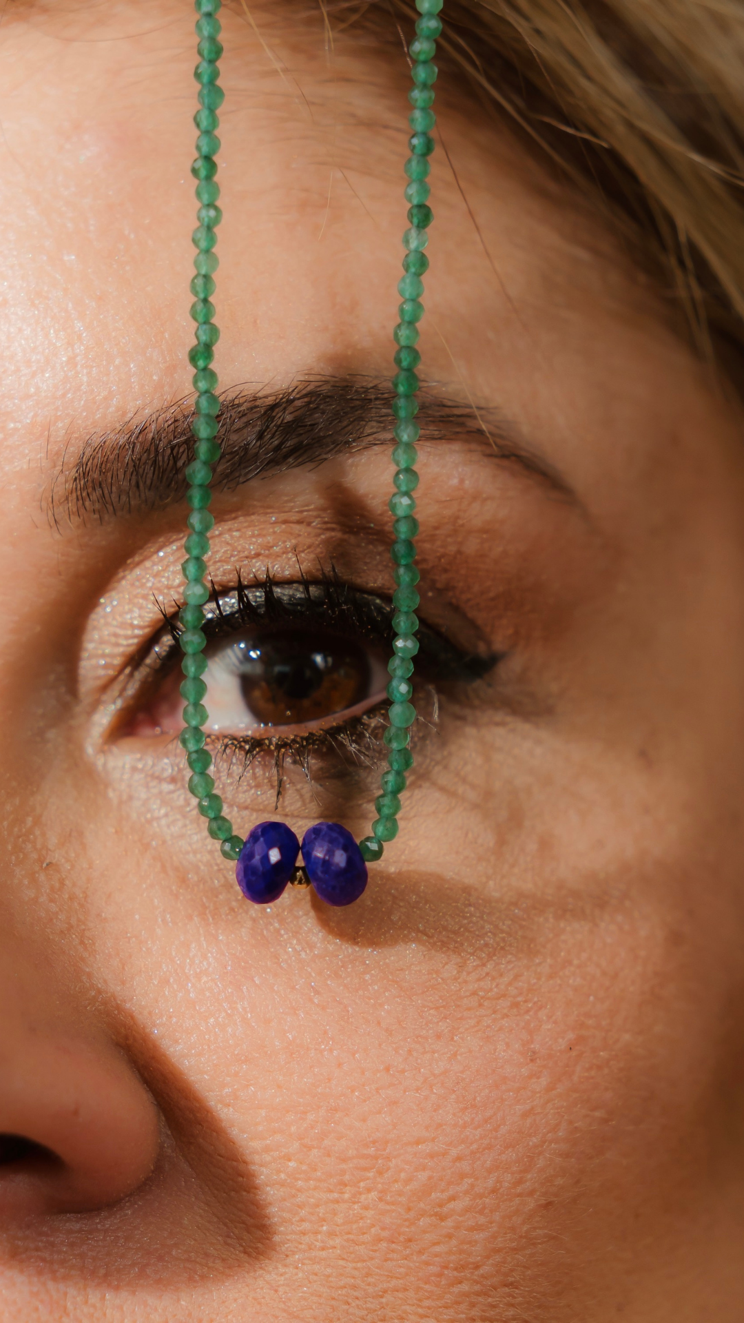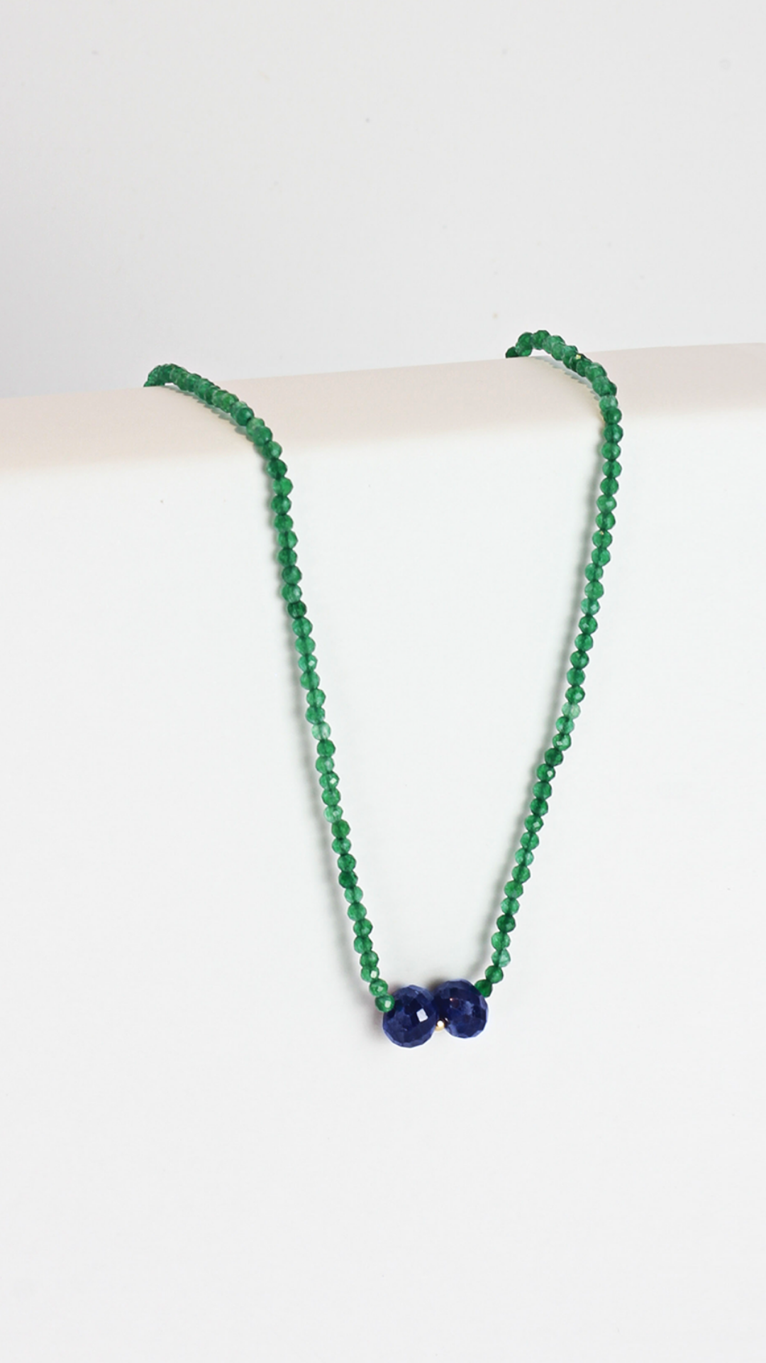 Colar com Jade verde, 2 Safiras e 1 esfera em Ouro amarelo 18k. Comprimento: 40cm.
